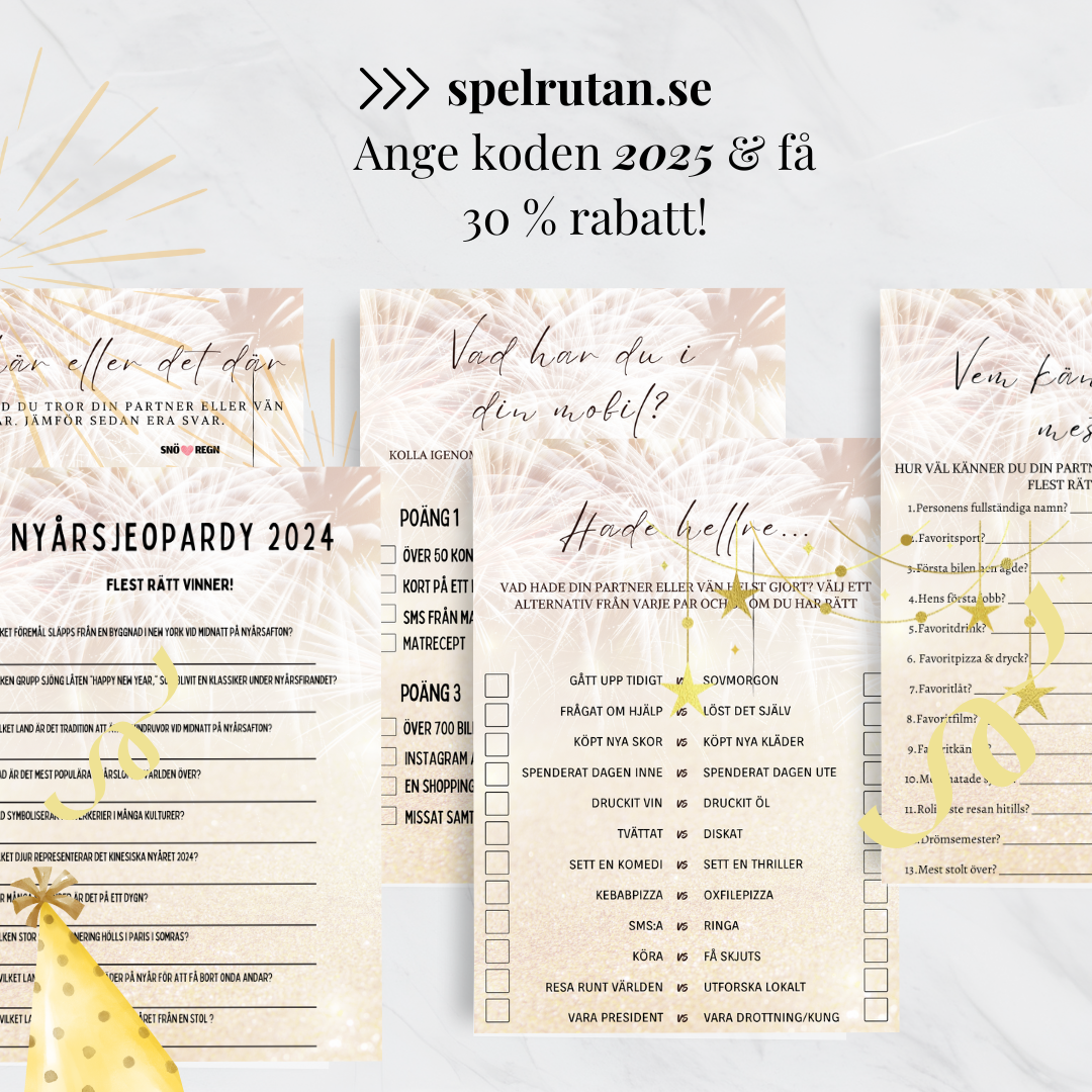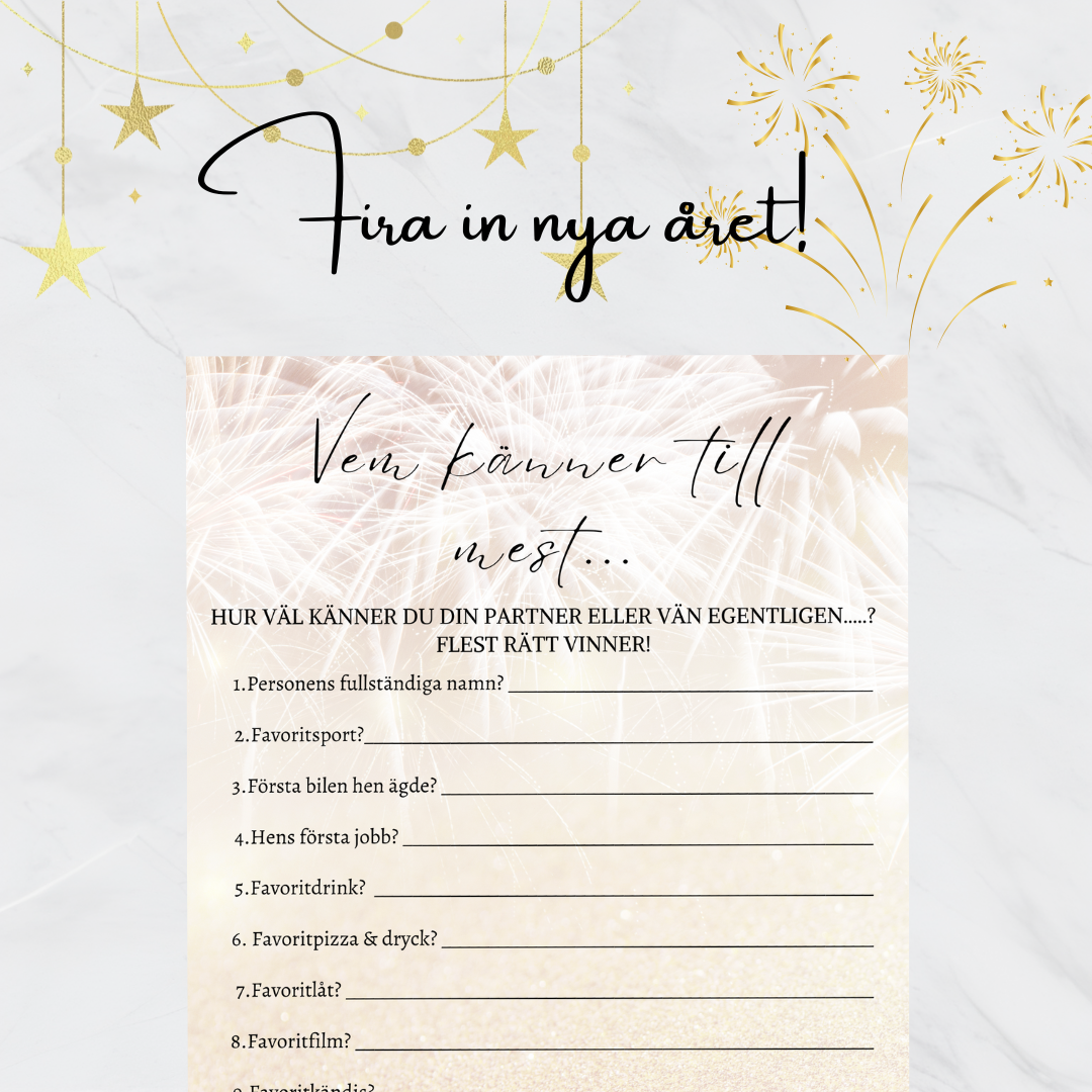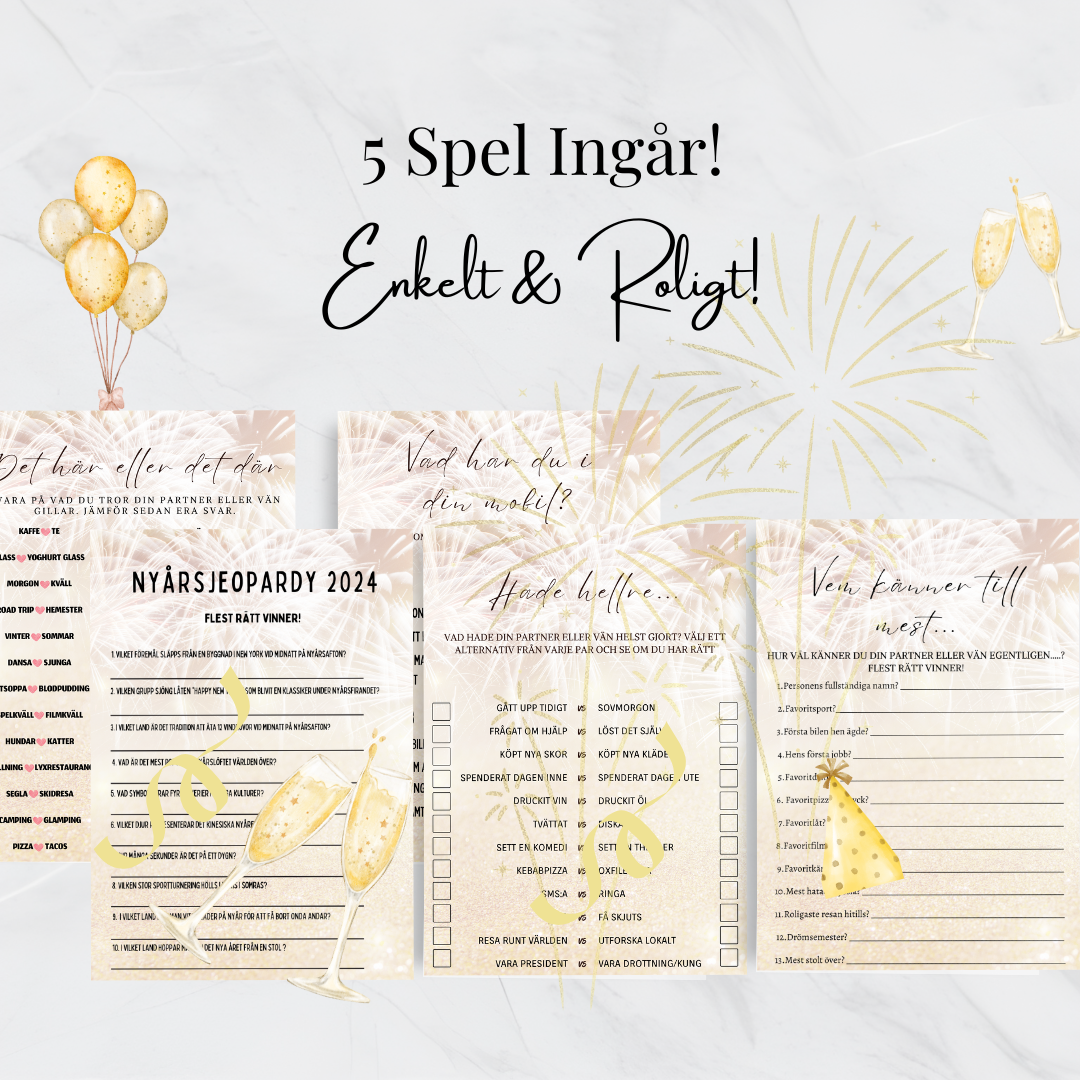 Letar du efter roliga sätt att kicka igång nyårsfesten? Då är detta nyårsspel något för dig! Här får du 5 lekar fyllda med frågor och utmaningar som garanterat får både dig och dina vänner att skratta, gissa och kanske avslöja lite roliga hemligheter. 🎉