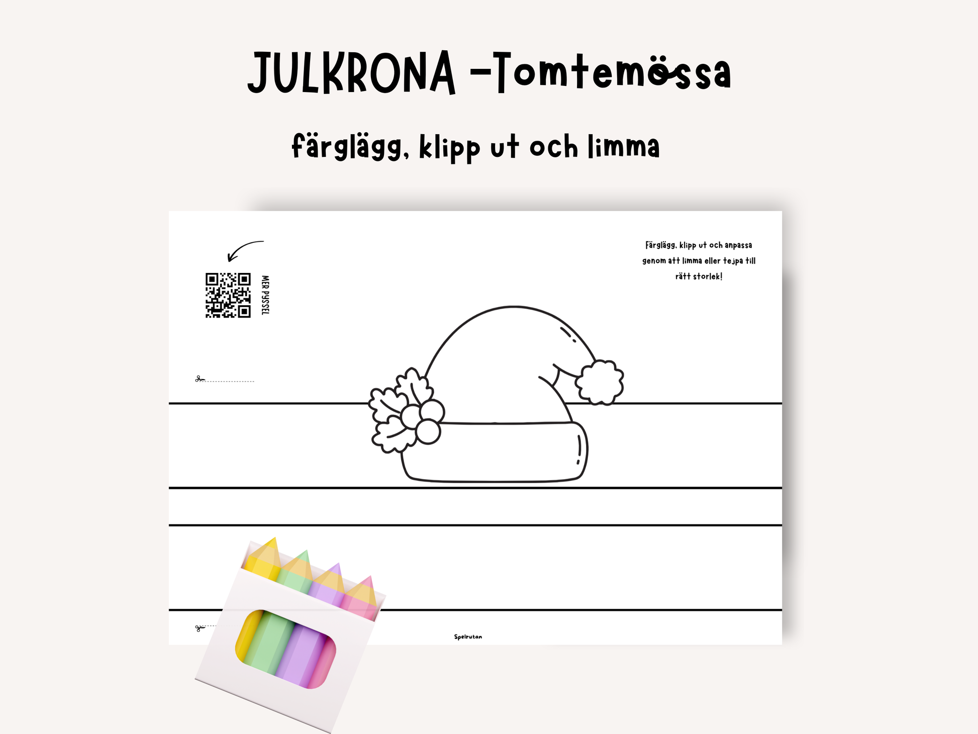 Gör barnens jul ännu mysigare med vår utskrivbara tomtemössa-krona! Perfekt för luciafirande, julfester, förskolan eller en härlig pysselstund hemma. Barnen får färglägga, klippa och sätta ihop sin egen tomtekrona – enkelt, kreativt och full av julstämning.
