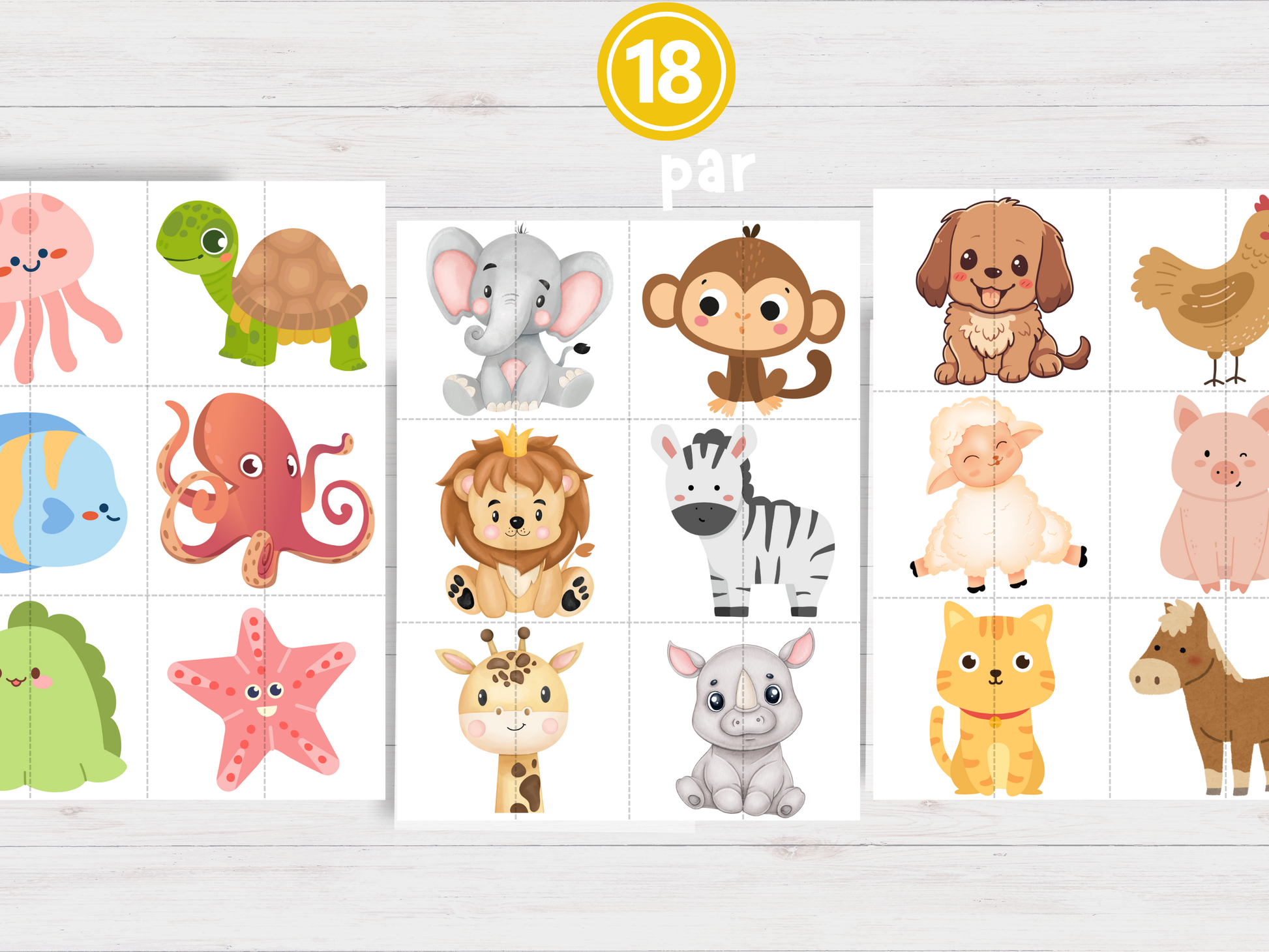 Matchningspyssel i pappersform i djurtema. 18 olika djur ingår.