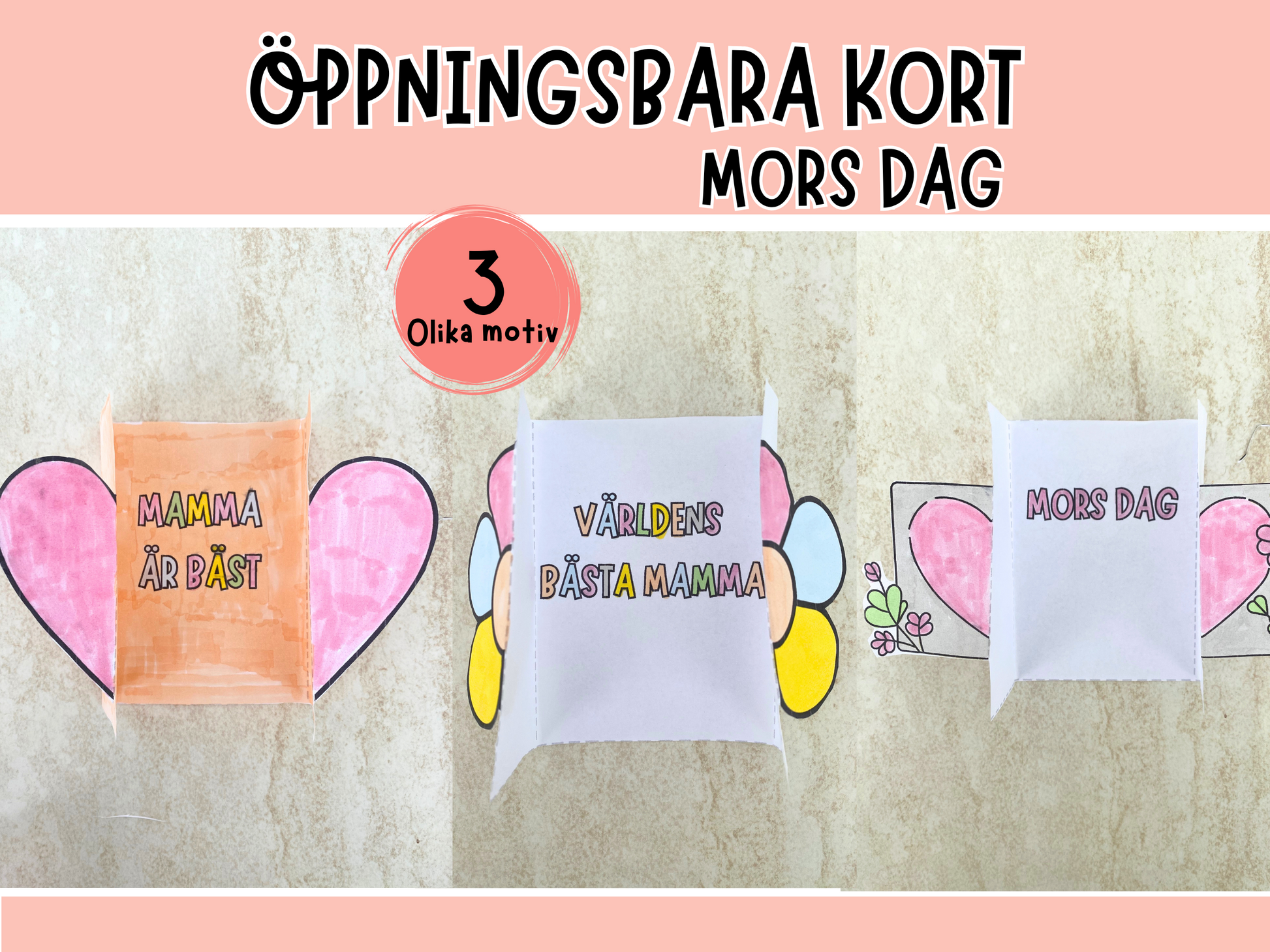 💐 Tre olika kortmotiv med mors dag-tema – alla är öppningsbara och barnvänliga
