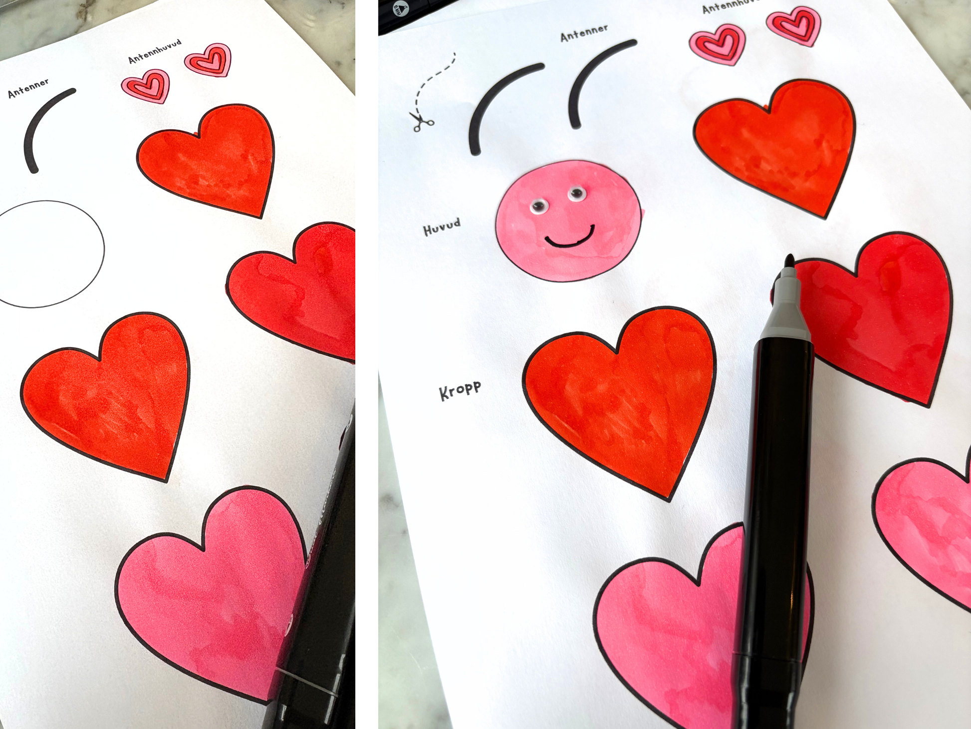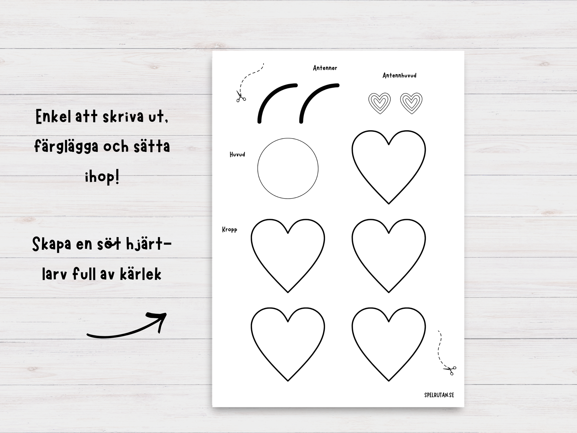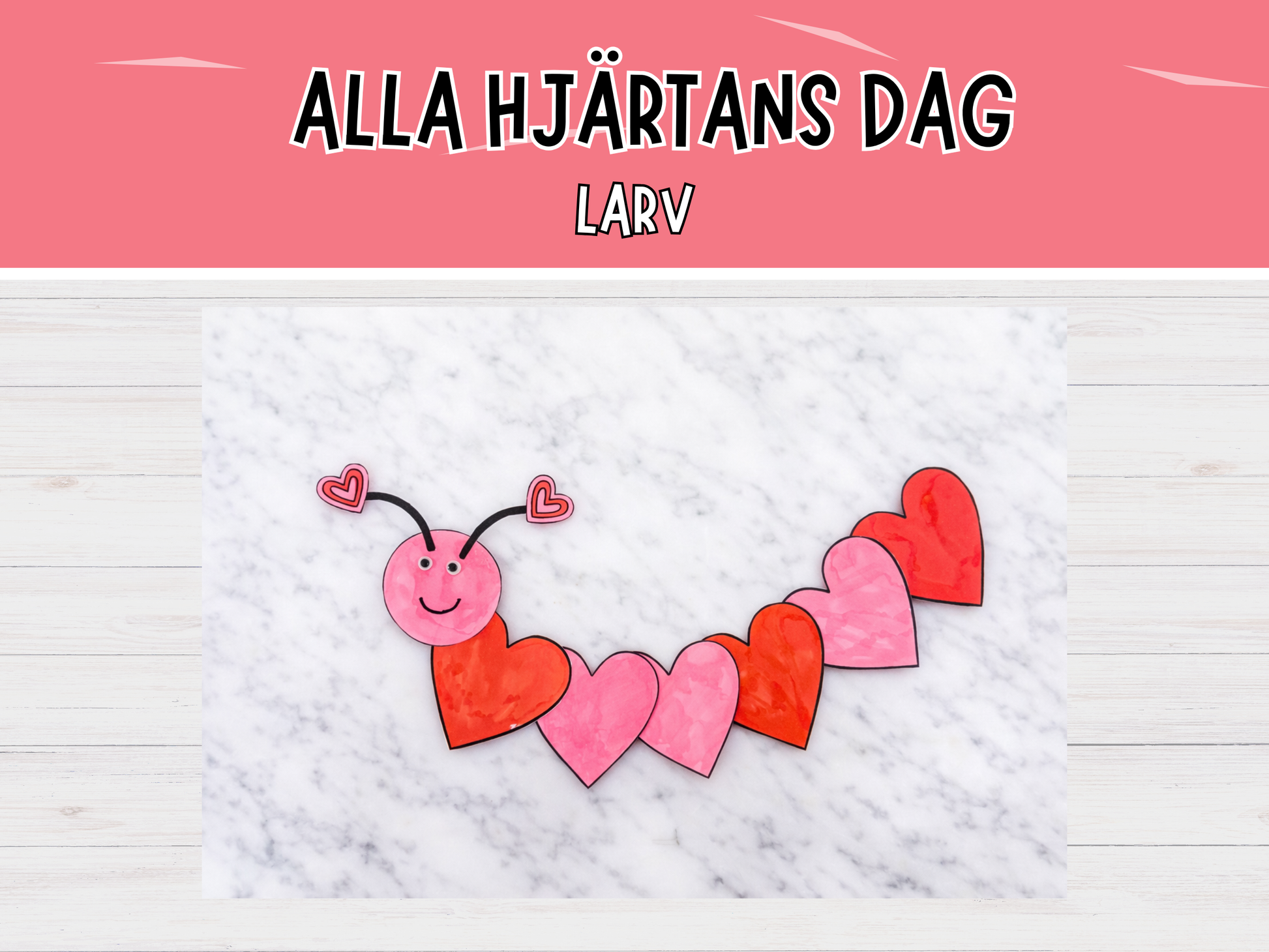 Skapa en söt hjärt-larv full av kärlek! I det här pysslet får barnen färglägga hjärtan, sätta dit ögon eller rita egna ögon och mun, och sedan klippa ut och limma ihop delarna till en charmig liten larv lagom till alla hjärtans dag.