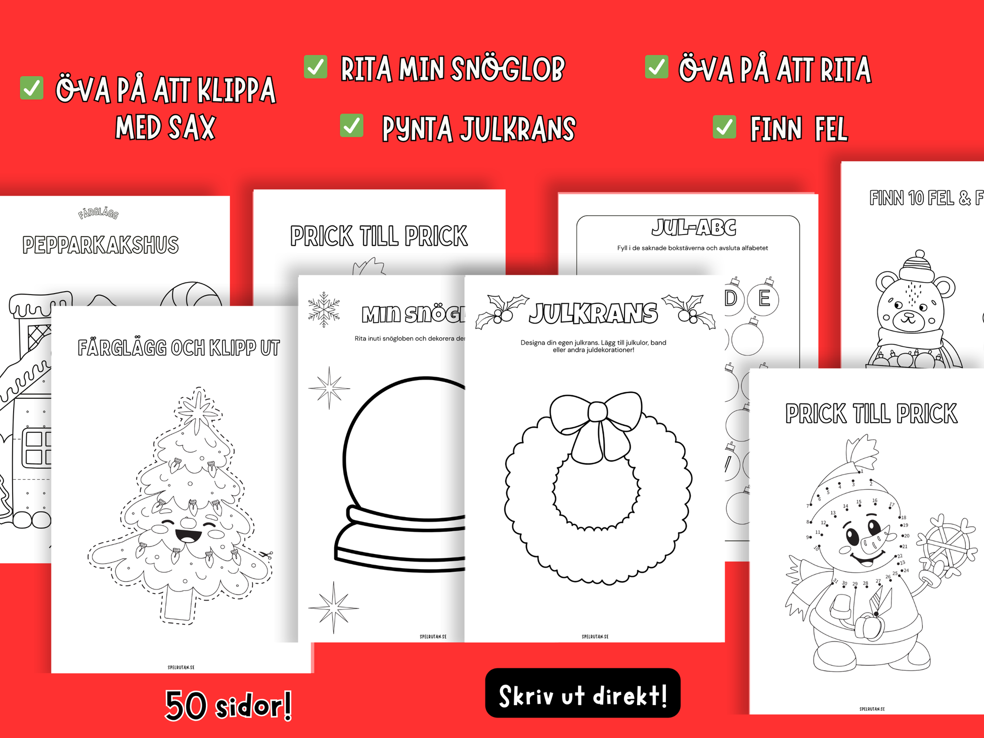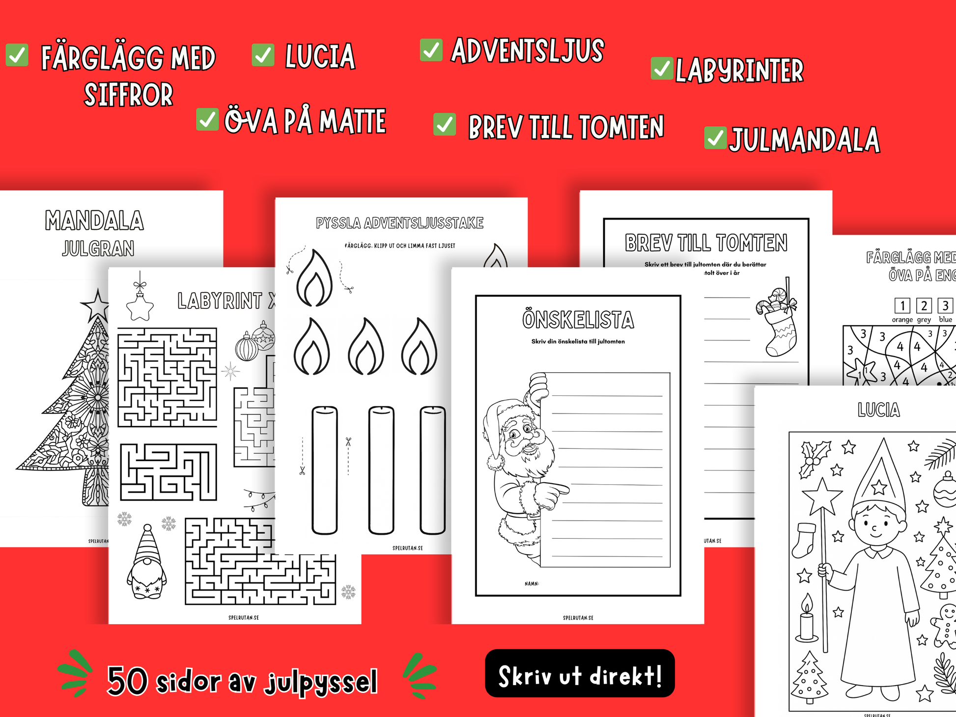 Gör december extra mysig med vårt stora julpysselpaket – hela 50 sidor fulla av roliga aktiviteter, klurigheter och kreativa pyssel som barn älskar! Perfekt för hemmet, förskolan, skolan, fritids eller som lugn underhållning under julfirandet.