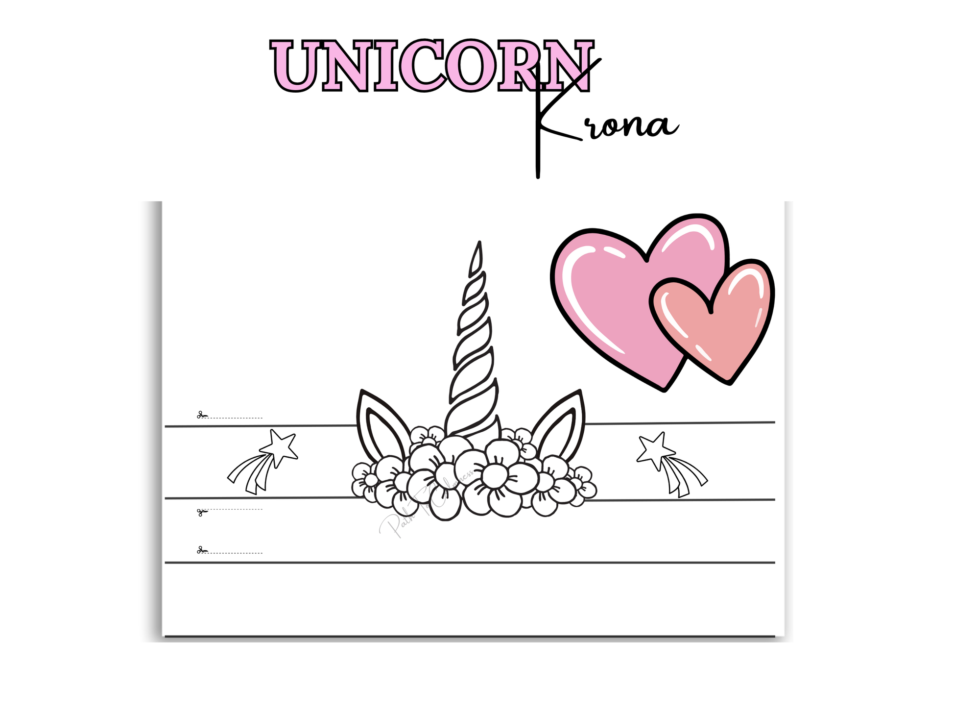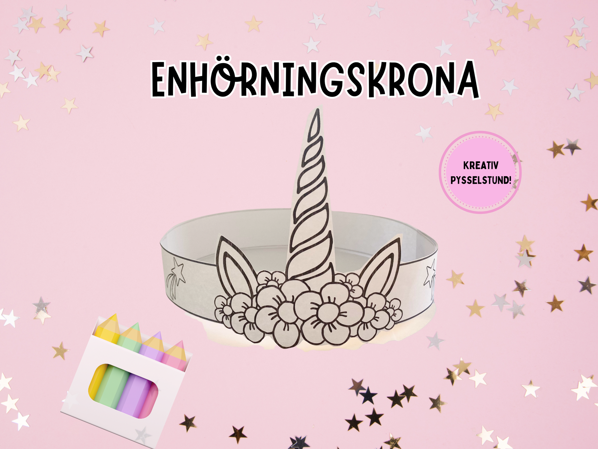 Enhörningskrona i pappersform. Kul pyssel till kalas, temadag, eller en dag hemma. Skriv ut så många du vill och låt barnen färglägga och dekorera sin egen krona.