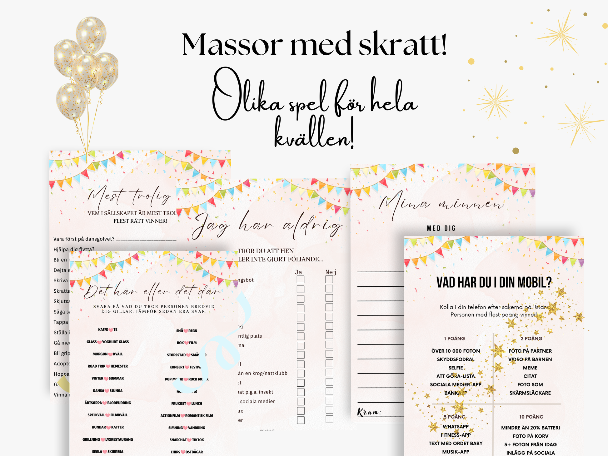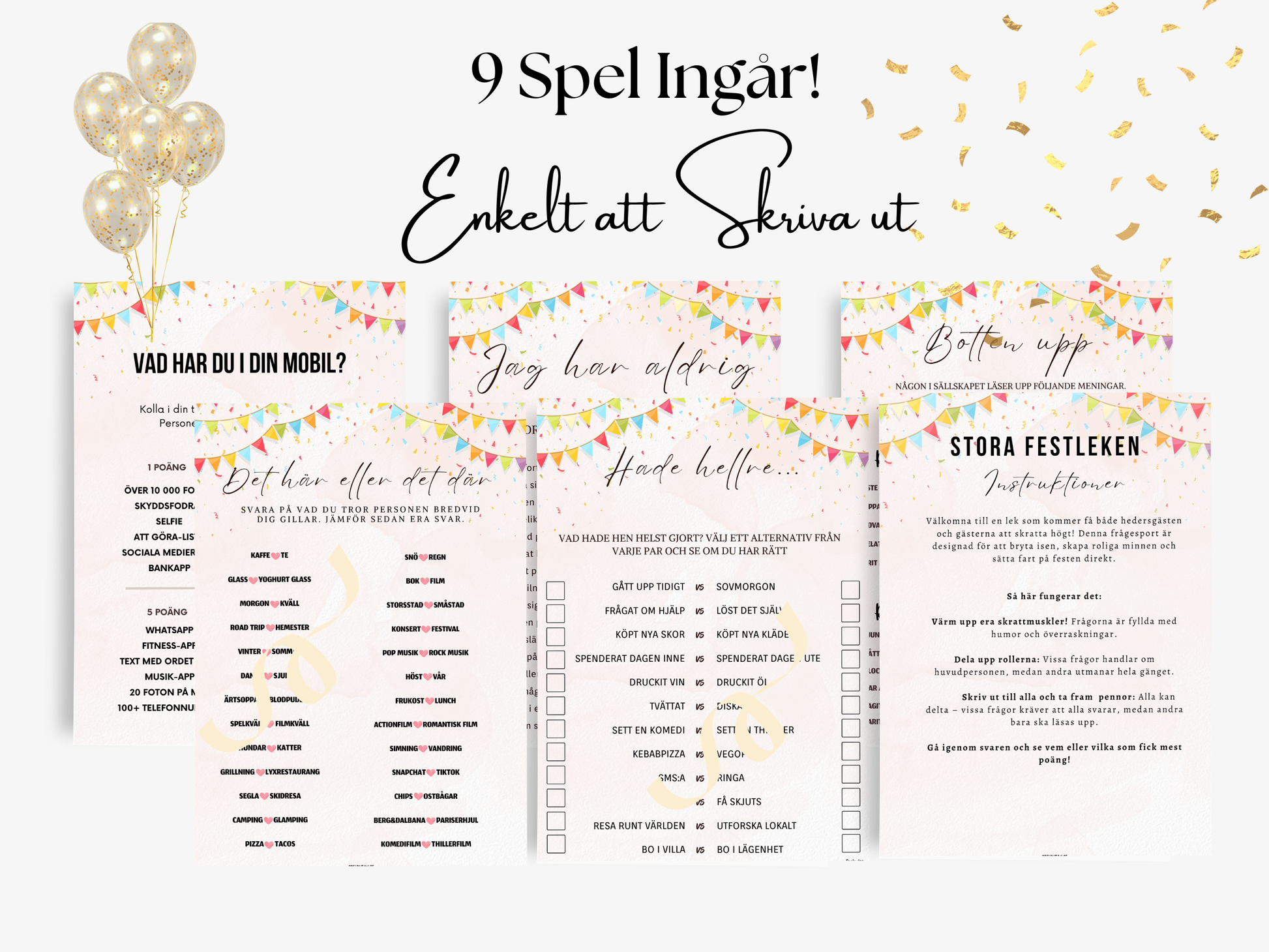 Letar du efter ett enkelt sätt att sätta fart på födelsedagsfesten? Då är denna festlek något för dig! Den är fullproppad med frågor som får både huvudpersonen och gästerna att skratta, gissa och kanske avslöja lite roliga hemligheter.